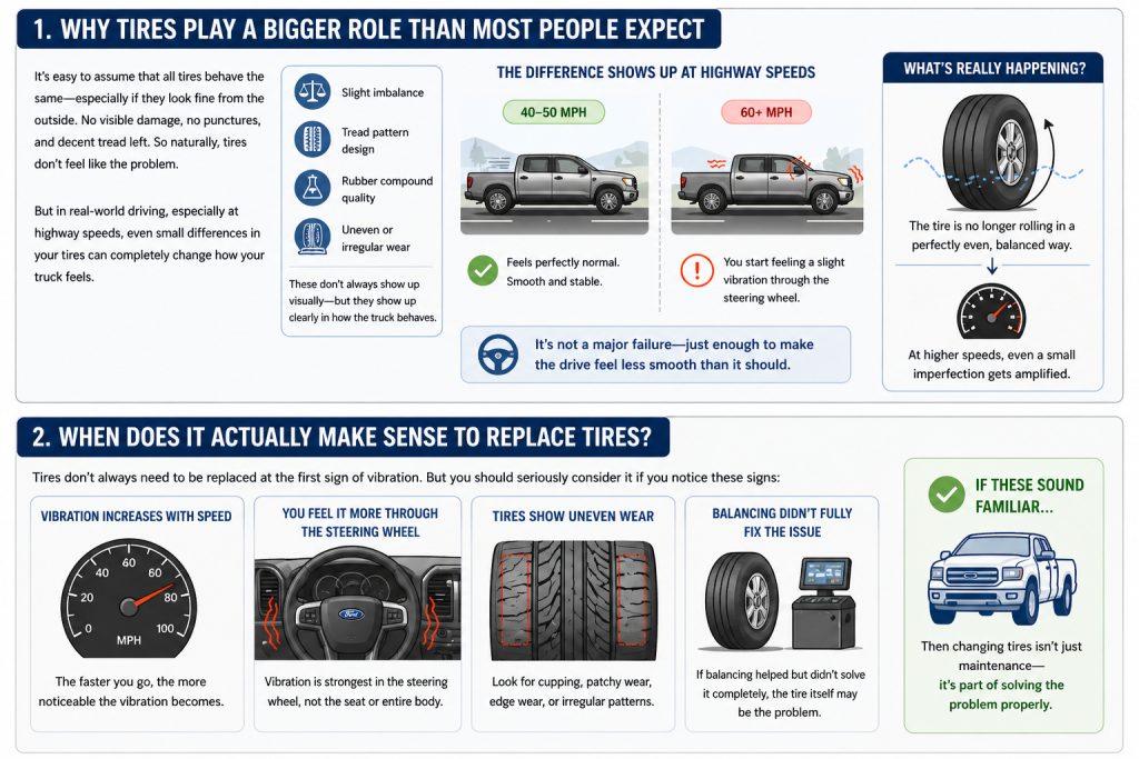 However, real-world driving—particularly at highway speeds—tells a very different story. Even small differences in factors such as slight imbalance, tread pattern design, rubber compound quality, or uneven wear can significantly influence how your truck feels on the road. These are not always issues you can easily spot by just looking at the tire, but they become quite noticeable once you start driving at higher speeds.